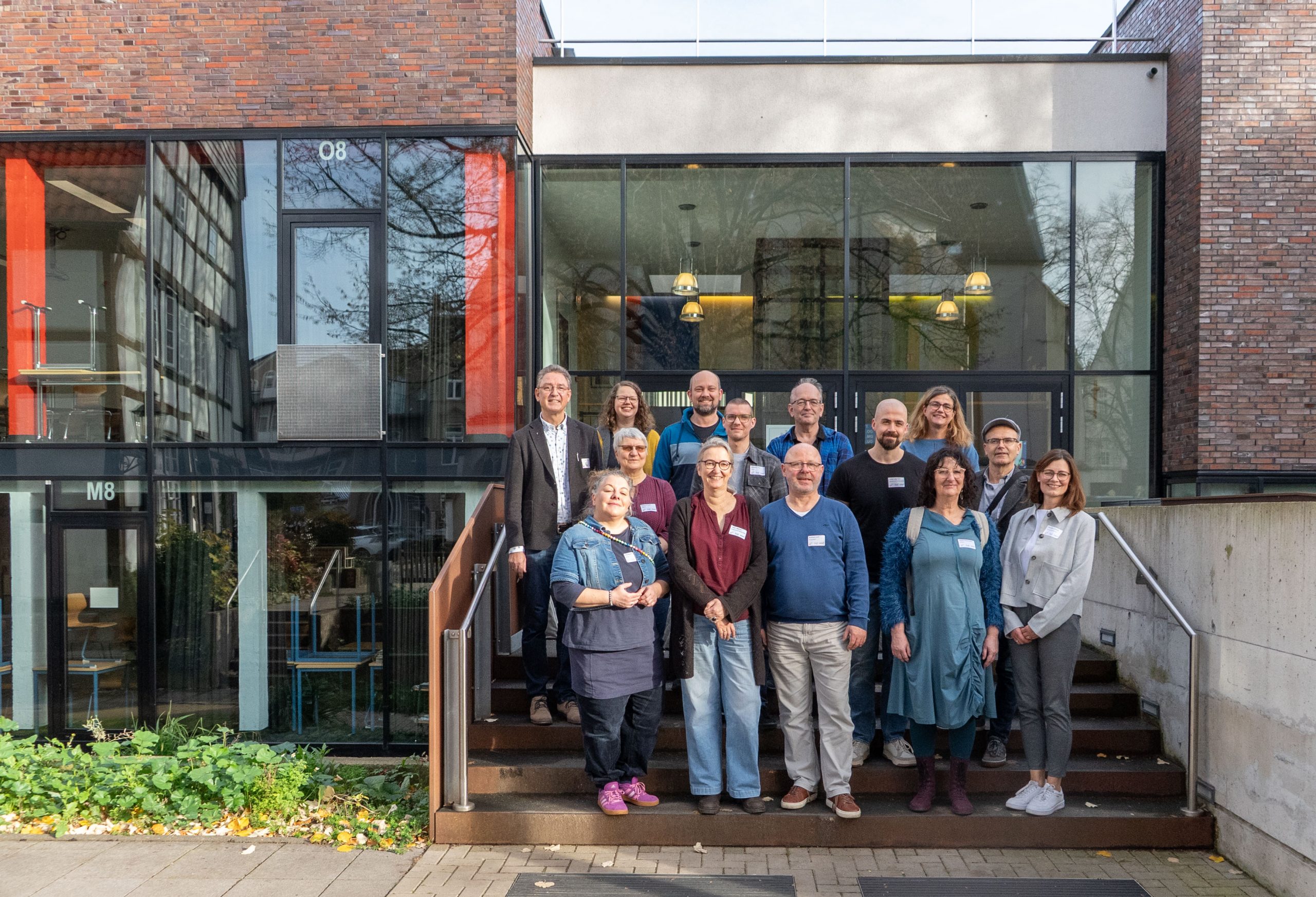 Das Orga-Team des Fachtags Musik- und Religionspädagogik am Elisabeth-von-der-Pfalz-Berufskolleg, Catrin Mawick und Burkhard Leich, umringt von den Dozent*innen, dem Vertreter der Schulleitung Lukas Lelgemann und der Fachberaterin des Kirchenkreises Claudia Loheide.