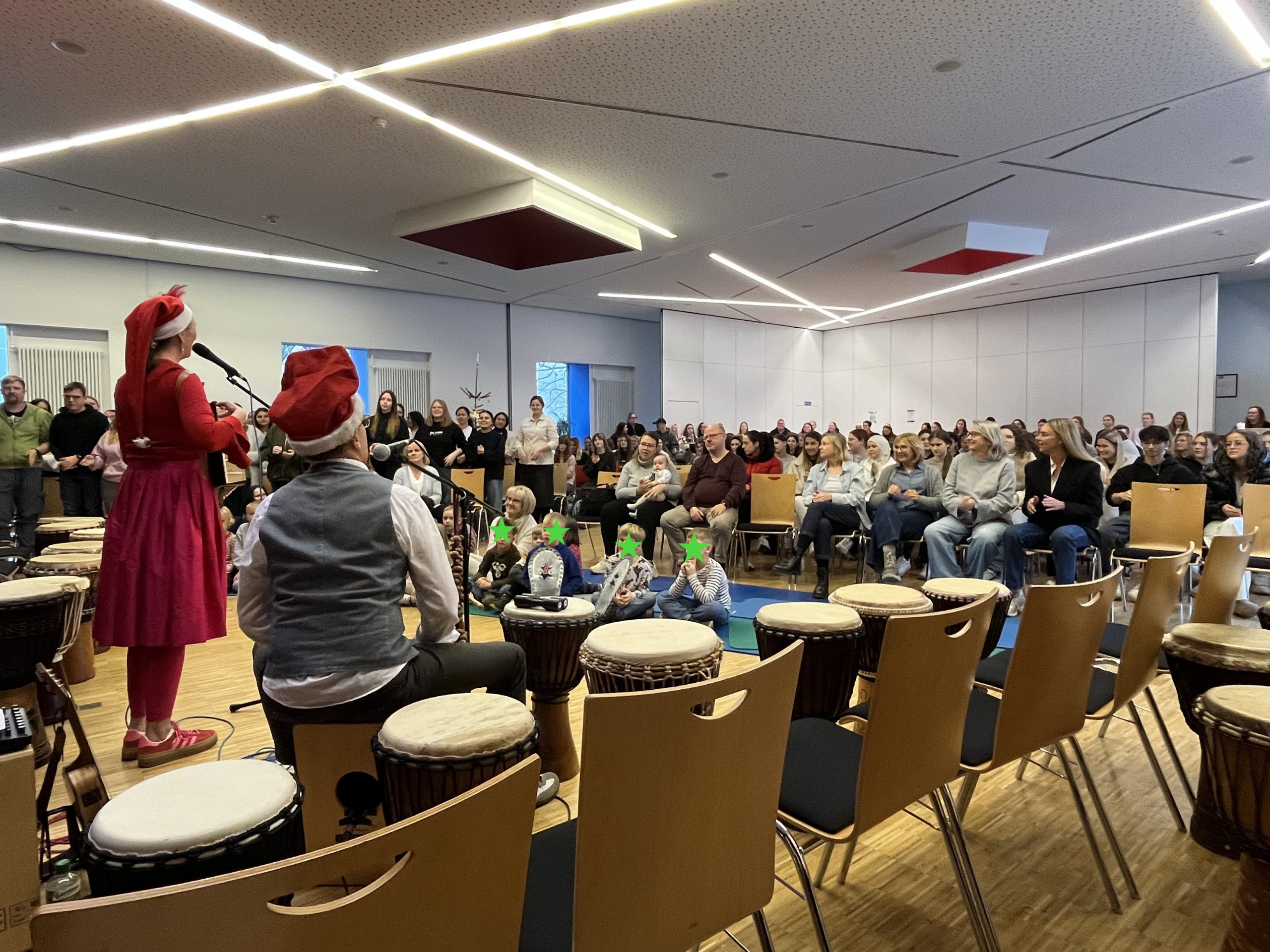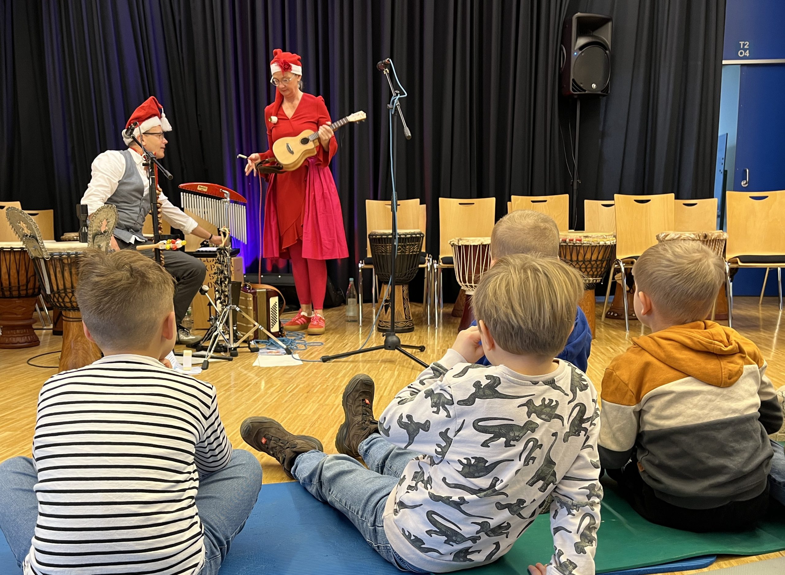 Ein besonderes musikalisches Highlight erlebte das Elisabeth-von-der-Pfalz-Berufskolleg kurz vor Weihnachten: Lieselotte & Marcus begeisterten Kinder, Jugendliche und Erwachsene mit einem stimmungsvollen Mitmachkonzert. Mit Ukulele, Schifferklavier, Trommeln und weiteren Schlaginstrumenten luden sie ihr Publikum zum Mitsingen, Bewegen und Mitmachen ein.